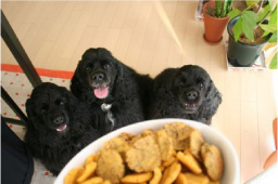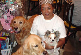 店長のerumamaさんとお店の看板犬達。左からエル、ソフィ、チャチャ |